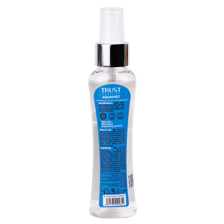 رنگ: بادی میست مردانه تراست مدل Aquamist با حجم 100 میل اسانس: مشابه عطر Hugo Hugo Boss گروه بویایی: آروماتیک، تند تازه، سبز، چوبی نت اولیه: صنوبر، سرو، نعنا هندی نت میانی: مریم گلی، شمعدانی، میخک، یاسمن نت پایانی: سیب سبز، نعناع، اسطوخودوس، گریپ فروت، ریحان